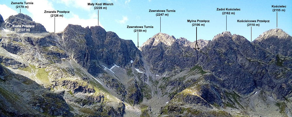 widok z drogi na szczytod lewej: Kozia Przełęcz (2137 m), Zamarła Turnia (2179 m), Zmarzła Przełęcz (2126 m), Mały Kozi Wierch (2228 m), Zawrat (2159 m), Zawratowa Turnia (2247 m), Mylna Przełęcz (2106 m), Zadni Kościelec (2162 m), Kościelcowa Przełęcz (2110 m), Kościelec (2155 m)
