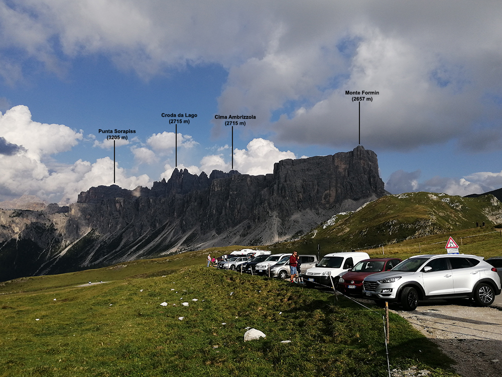od lewej szczyty: Punta Sorapiss (3205 m), Croda da Lago (2705 m), Cima Ambrizzola (2715 m) i Monte Formin (2657 m)